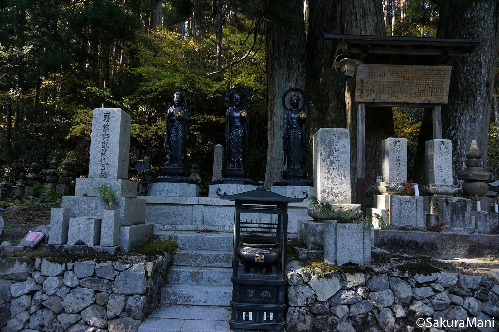 Our first destination was Jisonin. A Maitreya Buddha idol is enshrined in the main hall (Mirokudo). Further inside is a shrine called Nyuukanshofu. Earlier, women were not allowed to enter Koyasan. Kuukai lodged his mother at Jison-in during her last days, so that he could often meet her. Kuukai visited his mother every 9th of the month and since that this area is also called Kudoyama.